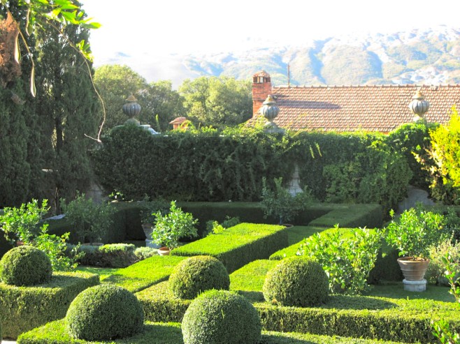 The perfectly manicured boxwood garden. Notice the unruly terrain in the background