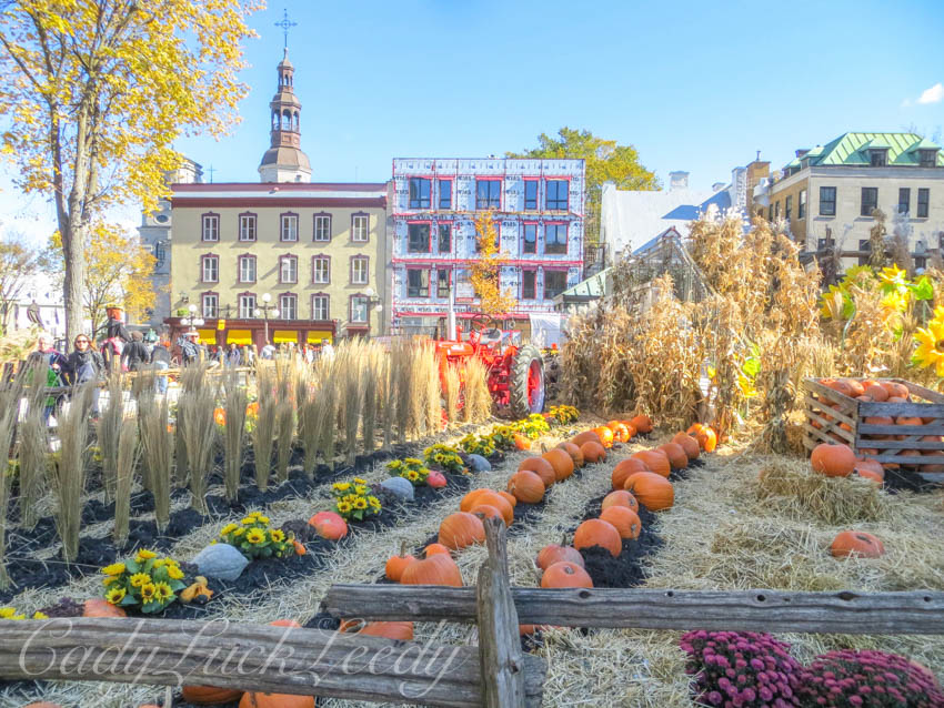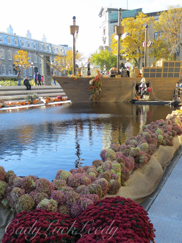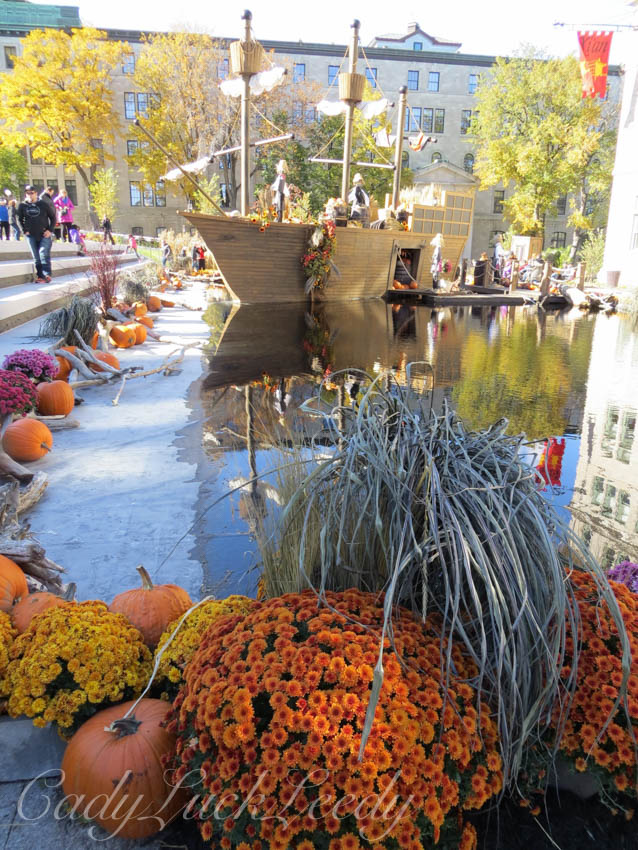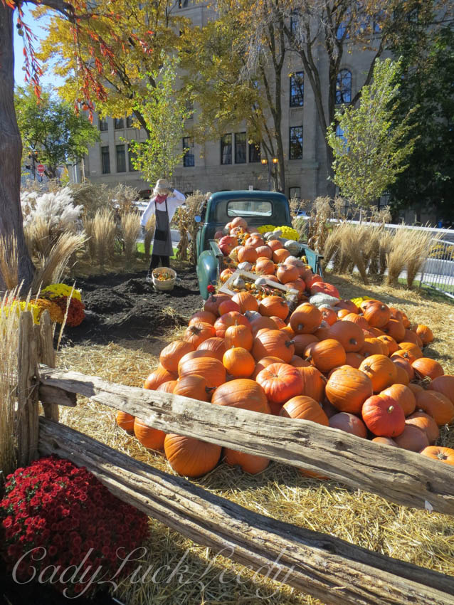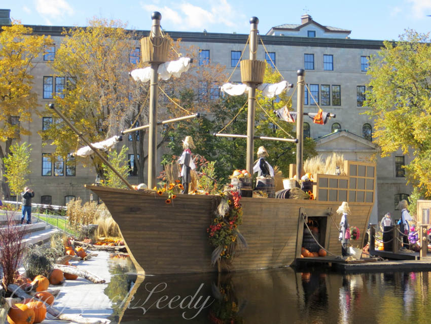 The new underground parking lot at Town Hall has been completed. There is now a lively garden area on top of the underground parking complex and it is the perfect spot to spend a fall afternoon! This year the focus of the park surrounds a sunken pool area, where a replica old sailing ship is moored among the fields of the harvest. Every year I can’t wait to see the adventure that awaits at Town Hall! Using the same props from year to year the displays created are always a new design. Hats off to all the workers and designers who make these displays possible! It is what sets Quebec City as the premier city in North America! Let’s load up the Harvest! Quebec City goes all out to decorate their city for Fall. What fun! Enjoy!
