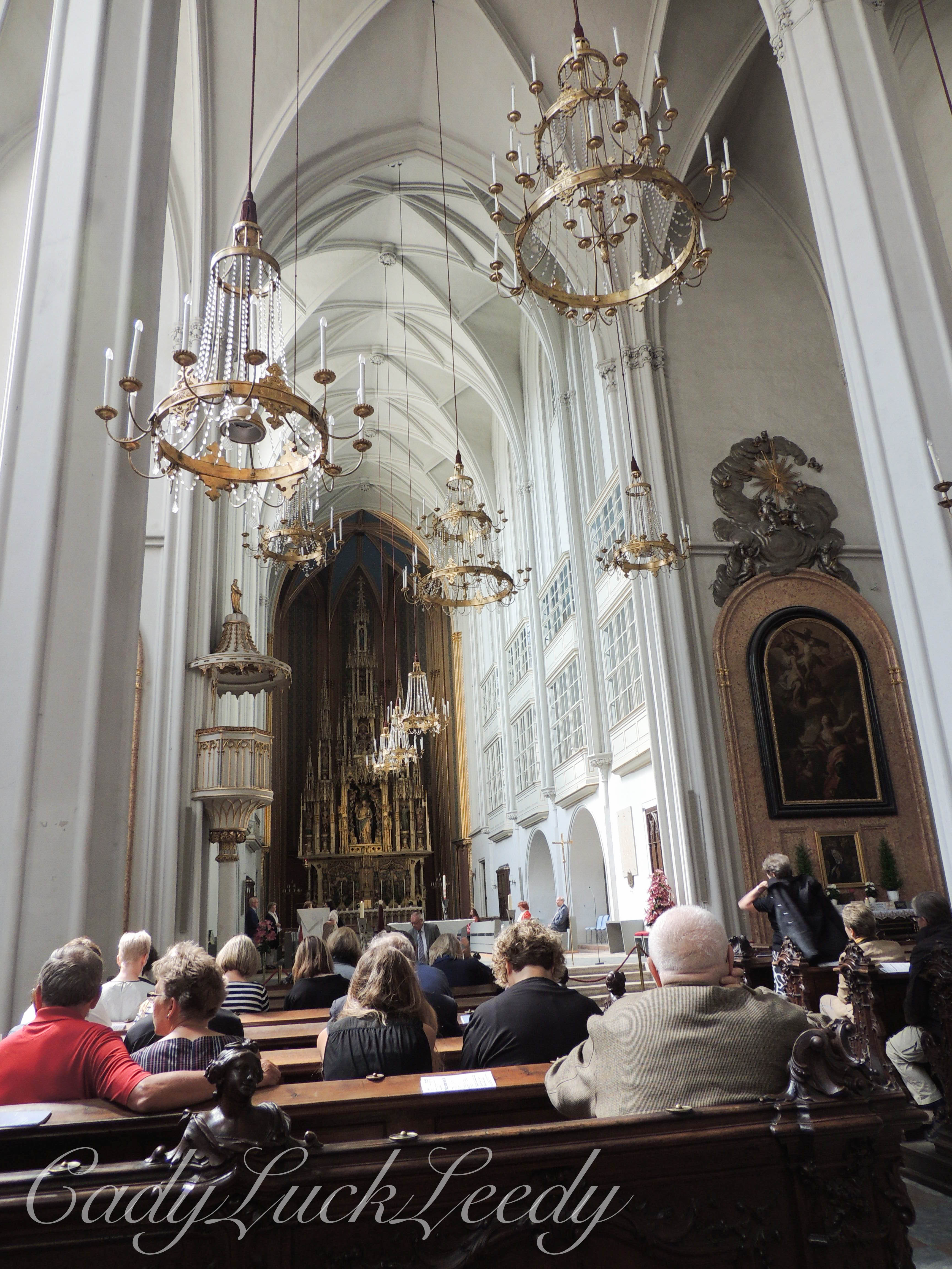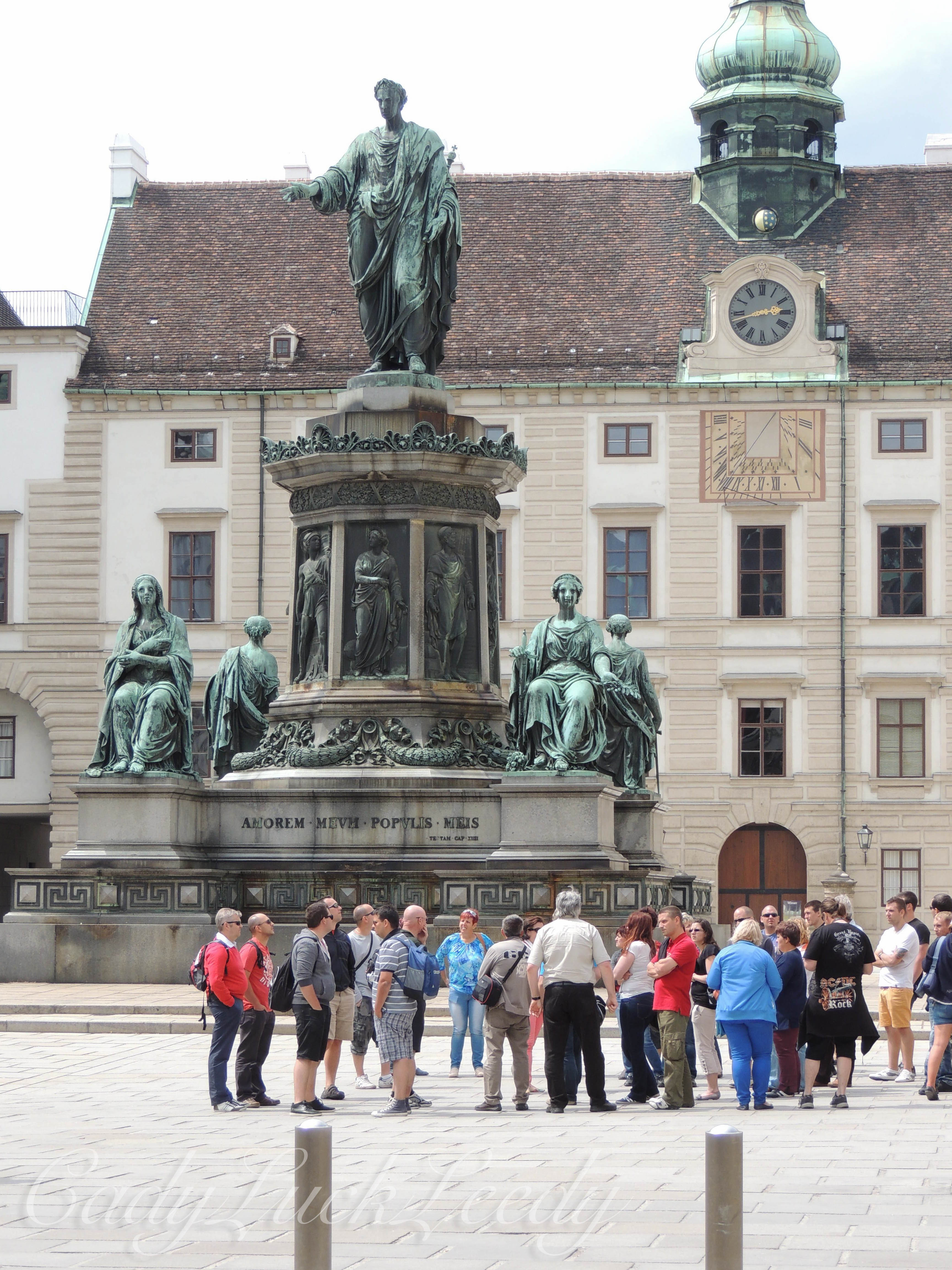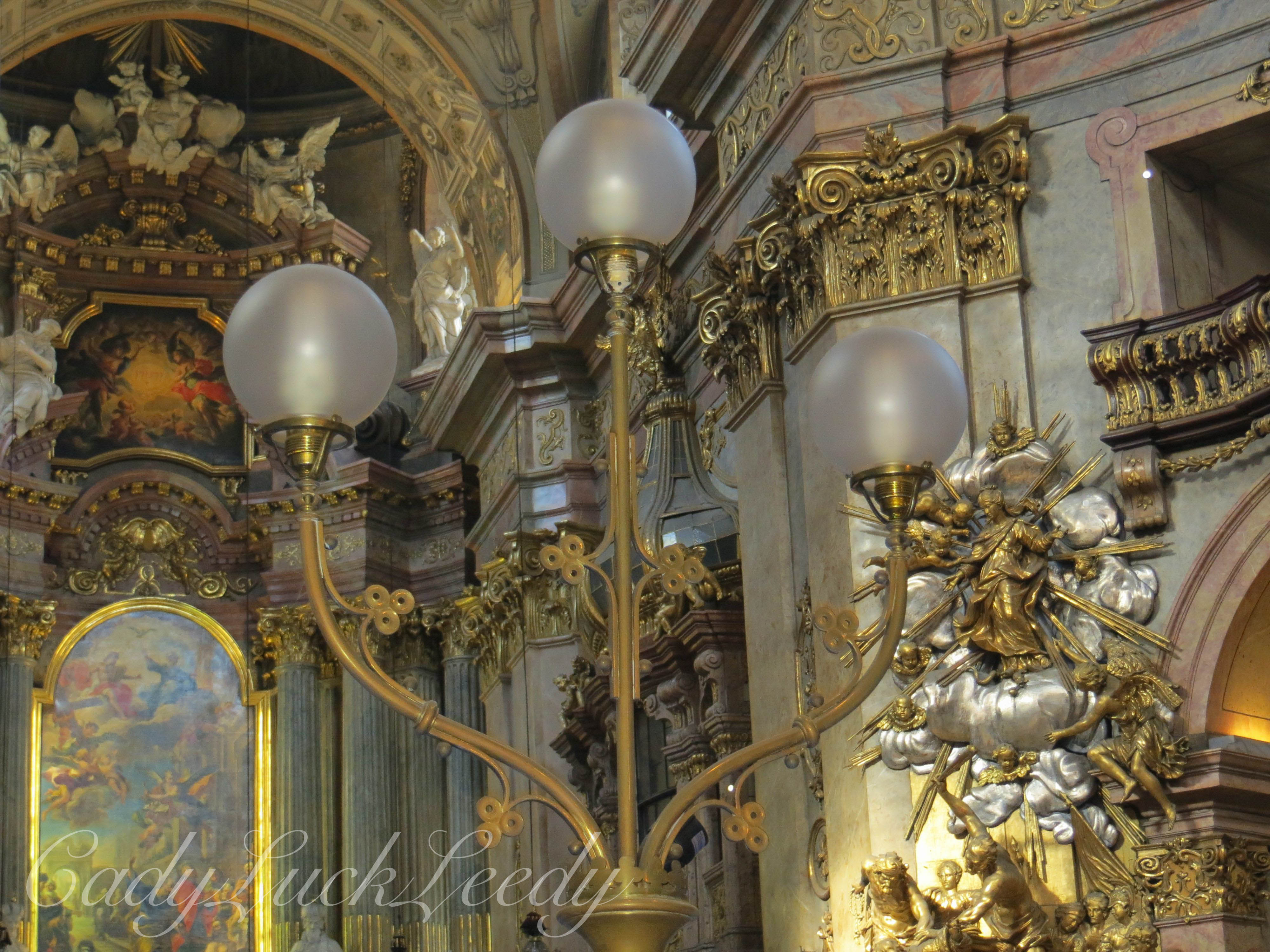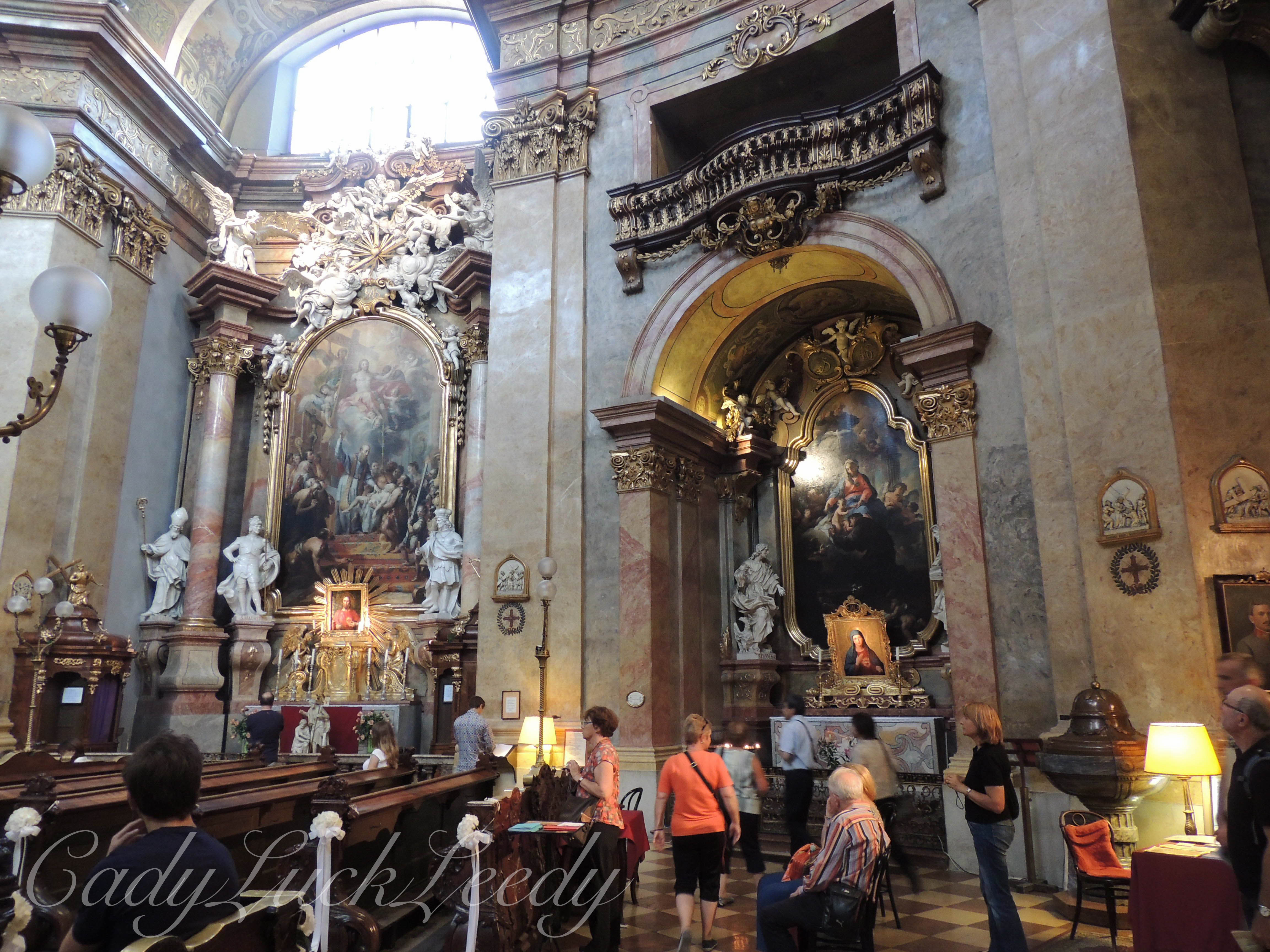 The Best. Coming out of Mass we walk over to St Peters Church. (Peterskirche) This church site dates back to the Middle Ages and was built on the site of the Roman encampment in the Graben. In 1661 the church burned down and a new church was built when Leopold I took a vow to rebuild this church when Vienna was ravaged by the plague in 1679. This church was the first domed structure in baroque Vienna and fashioned after St Peter’s Basilica in Rome. Situated in a very compact space, closed in between the modern Vienna, once inside, the interior is rich with gold stucco. Today we are there as a wedding couple are exiting the church and we observe the church decorated beautifully for the wedding!