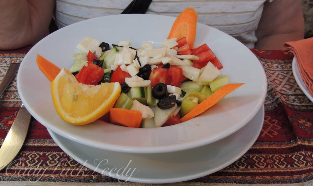The New Hatay Restaurant is an outdoor restaurant right outside our hotel.  The hosts, stand outside the restaurant, and pull everyone aside, who will listen, to encourage you to look at their menu and food.  I was enthralled with the bread!  Men brought the combination puffy/flat bread from a brick oven nearby that had a line of patrons waiting for the fresh, scorched bread. Then there was the food, so colorful, so exotic looking! And they served wine! Need I say more? We had to try this place first ! A good way to end our first day! Enjoy!