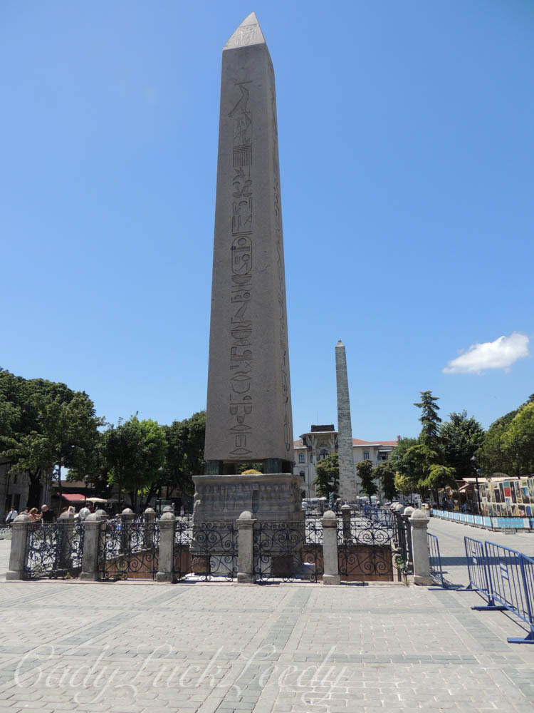 The Egyptian Obelisk was carved 1500 years before the birth of Christ to honor the Egyptian Pharaoh Thutmose III, and to commemorate his military achievements. The obelisk was brought here from the Upper Nile and is only the upper one third of the original massive stone block. The base of the block was cut of local marble and the four sides tell the story of Theodosius the Great, and his family, as they sat here watching the chariot races at the Hippodrome.