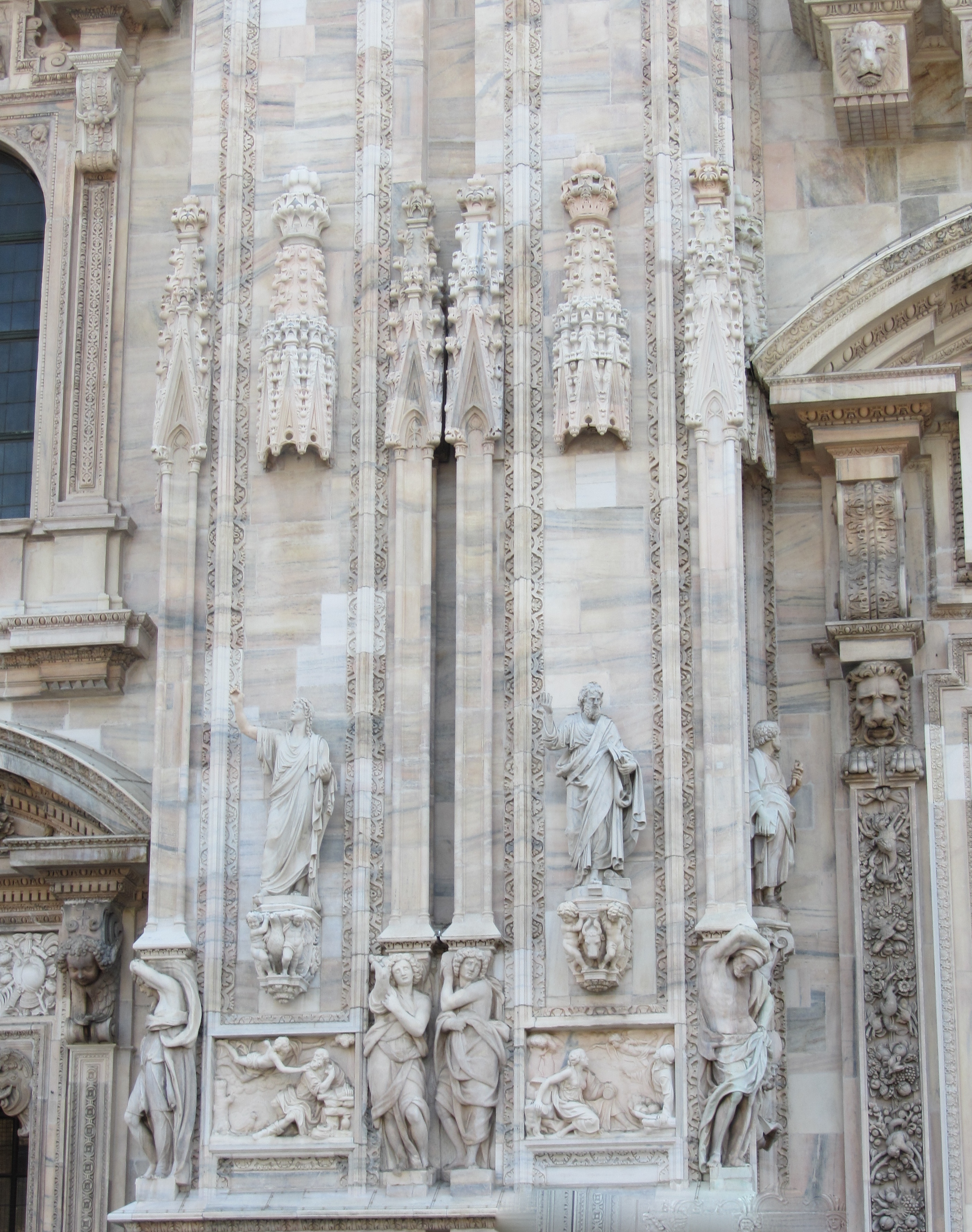 Lorenza meets us at the central train station and after going up several escalators in the fashionable shopping area of the train station, Lorenza buys tickets for the metro and we are off! It is early morning and the streets are quiet. First stop, the Duomo, with a forest of spires on its roof, is the fourth largest church in Europe, after the Vatican’s, London’s, and Seville’s. The church was built with Pink Candoglia marble, rafted in from a quarry 60 miles away. We went past this quarry on the train when we went to Cinque Terre. Marble is still extracted from the sight. Inside the church is a beautiful marble mosaic floor and looking up we see The Quadroni, (large paintings on canvas, each about 20 by 26 feet) depicting the life of St Charles Borremeo. The paintings have been brought out and displayed for a special anniversary in the church. The 1st cycle of paintings (starting in 1602), The Facts of Life of Blessed Charles, consists of 28 paintings depicting his life, and were painted by seven different artists. The 2nd cycle, The Miracles of St Charles, consisting of 24 smaller paintings of his miraculous works and healings, were all painted between December 1609 and November 1, 1610, when Charles was canonized. These paintings were displayed for the first time together on November 4, 1610, when the paintings of his miracles could be shown after he had been declared a saint. Now they are only displayed on special days in the church and we were fortunate to be able to see them.
