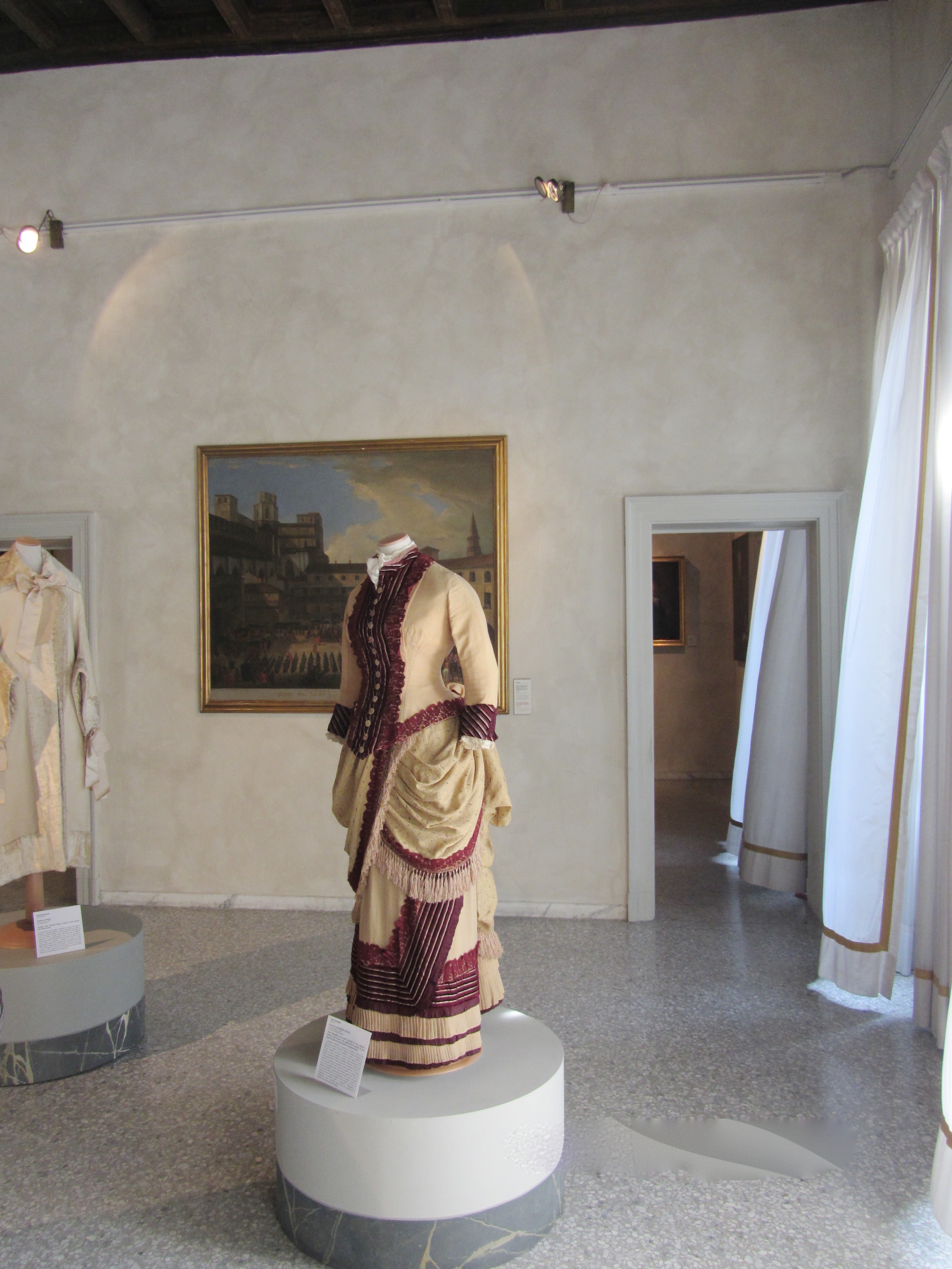 After the church, we are delighted to be shown a small museum in a private palazzo. I have wanted to see what was behind those big oak doors! Following Lorenza, we are lead through an intricate laid marble entryway and up the stairs to the private apartments. Today there are collections of clothing, shoes and those little bitty one woman carriage/carriers that were lifted on the shoulders of servants to whisk one about town and prevent your dress and shoes from being soiled. Boy were those women TINY! On the outside of the palazzo is a beautiful fresco above the rim of the windows. (See the video I made)