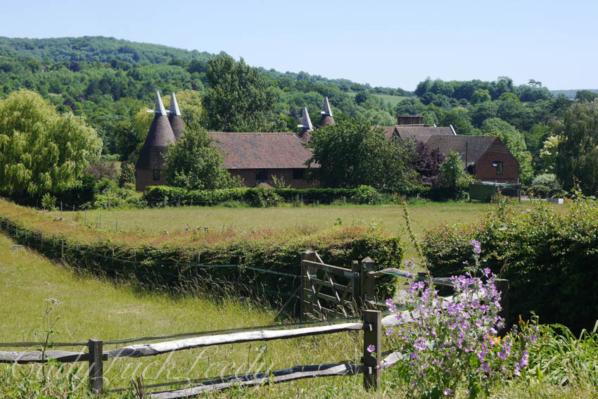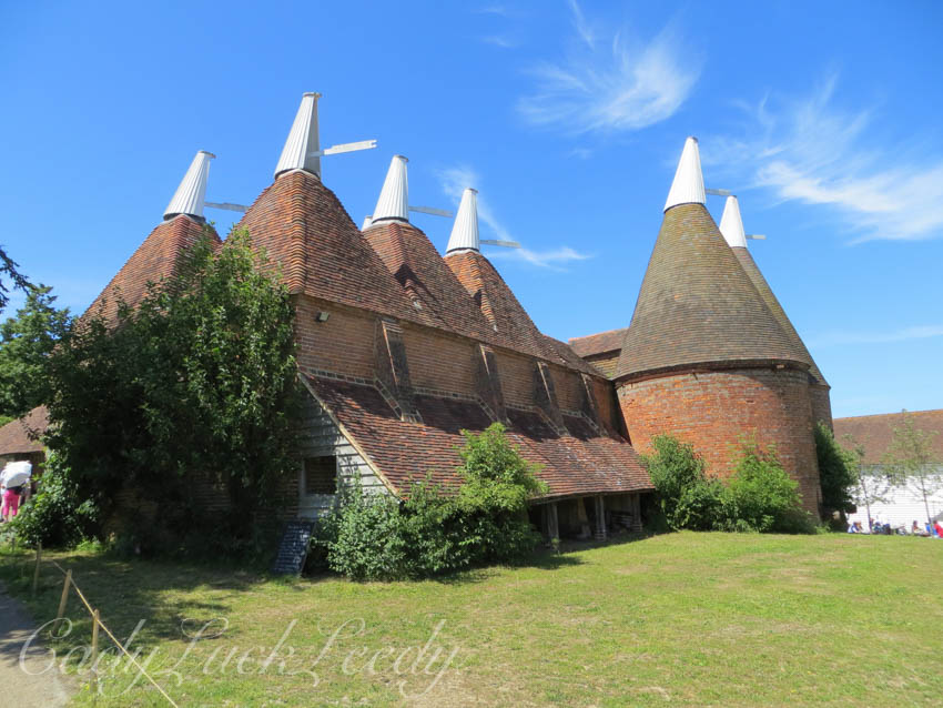 Driving around the Kent countryside one can not help, but notice, the oast; a building designed for drying hops, as part of the brewing process. The oast consisted of two or three storeys, on which the hops were spread out to be dried by hot air from a wood or charcoal-fired kiln at the bottom. The drying floors were thin and perforated to permit heat to pass through and escape through a cowl in the roof which turned with the wind. Hops were picked from hops gardens by gangs of pickers, who earned a fixed rate per bushel. The green hops were put into large hessian sacks, called pokes, and the pokes were taken to the oast. Some oasts had a man-powered hoist, (a pulley and rope) used to hoist the green hops to the drying floor. Green hops had a moisture content of 80%, which needed to be reduced to 6%. The drying floors were 1 1/4 inch square battens nailed at right angles across the joists so there was a gap between each batten and this was covered with a horsehair cloth. The hops would be spread 12 inches deep, the kiln doors closed and the fire lit. Routinely, the men would have to turn over the hops, by walking across the boards and raking it over, in order for the hops to dry properly. What a hot and dangerous job that would have been! When the hops were judged to be dry, the furnace would be extinguished and the hops removed from the kiln using a scuppet, a large wooden shovel. The hops would then be spread out on the stowage floor to cool and afterwards be pressed into large jute sacks, called pockets, with a hop press. The pockets were then sent to market where the brewers would buy them and use the dried hops in the beer process to add flavor and act as a preservative. Next time you are in a local English pub and see the yellow-brownish, weedy, looking rope, strung about the ceiling and hearth, you’ll know you are looking at picked hops! Enjoy that beer!